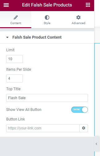 Restrofood provides a flash sale slider Elementor widget to show on sale products. Follow the screenshots to set the settings.